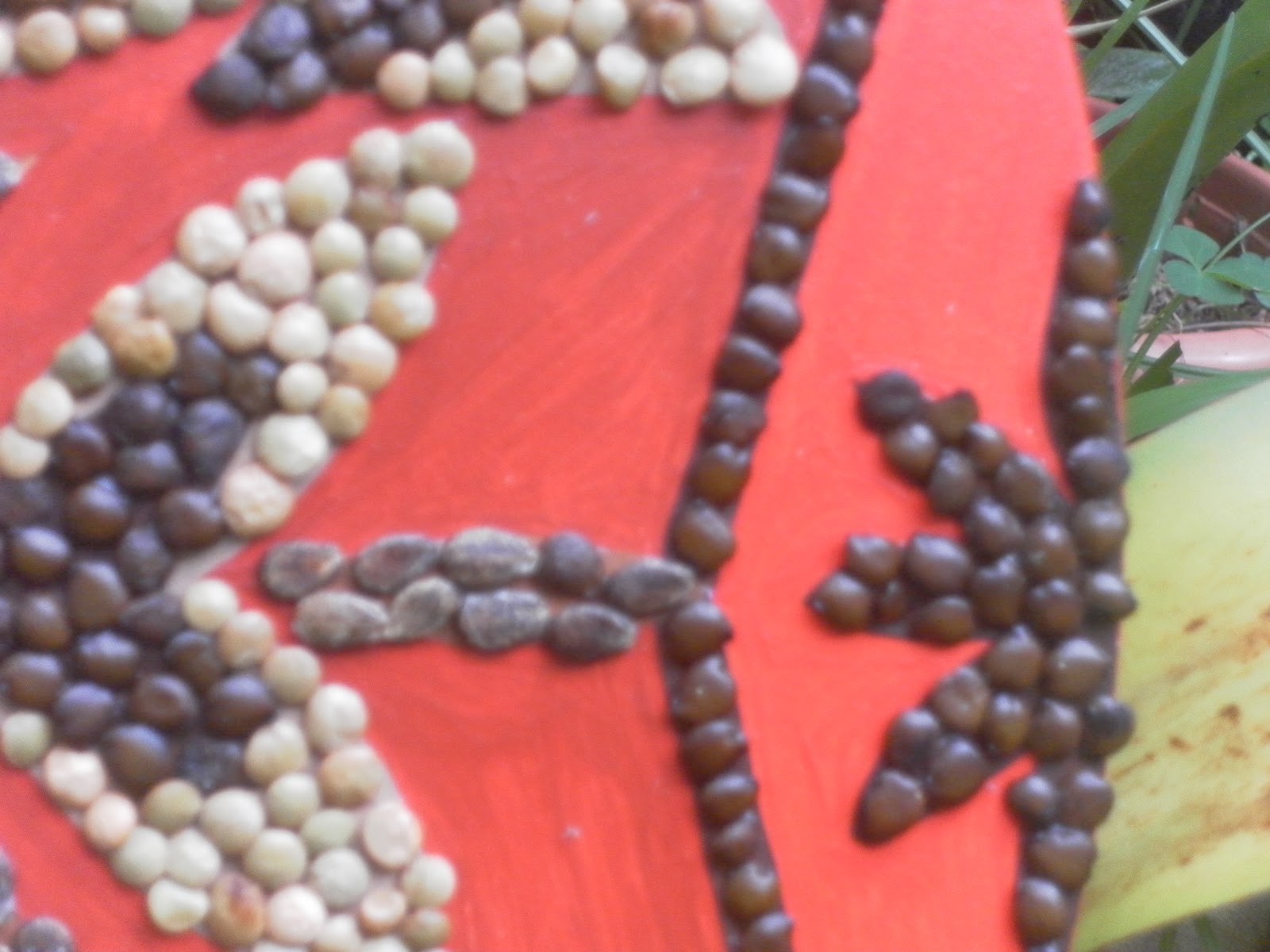 A terceira semente foi a lentilha, por ser de um tom de marrom mais claro que as anteriores. Em seguida o verniz fixador fosco, para dar proteção à pintura e às sementes. |